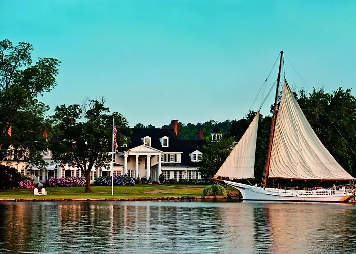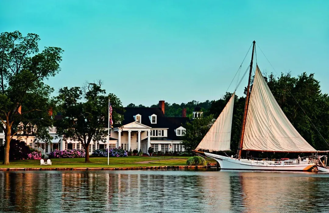 Inn At Perry Cabin is a five-star hotel featuring 78 unique rooms, including 30 spacious suites, along the serene Miles River. The resort offers amenities such as a spa, golf course, and various water activities, emphasizing casual luxury.
