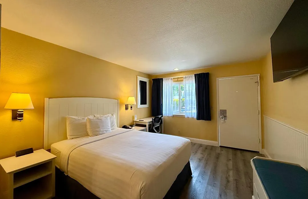 Monterey Bay Lodge features 46 guest rooms, including family suites and a single Bedroom Suite with a Full Kitchen. Rooms include amenities such as flat-screen TVs with cable channels, microwaves, refrigerators, and work desks. Guests staying in this king bed room can enjoy complimentary toiletries, plush towels, and a private bathroom with shower/bathtub.