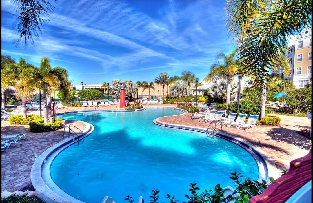 Calypso Cay Vacation Villas, rated 8.4/10, is a family-friendly Kissimmee hotel offering spacious villas with full kitchens and a year-round outdoor pool featuring a waterslide. Additional amenities include complimentary Wi-Fi, concierge services, and access to a 26-foot rock climbing wall.