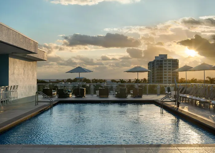 Leisure amenities include an outdoor swimming pool featuring Delray's only rooftop pool bar, along with a well-equipped fitness center available 24 hours. Guests can rent bicycles for local exploration.
