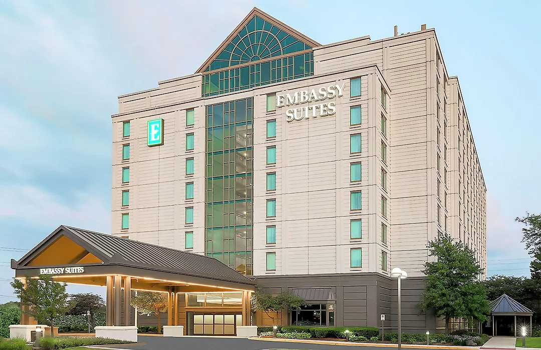 Rooms at Embassy Suites feature amenities like microwaves, refrigerators, and flat-screen TVs. Certain suites include a separate seating area, providing additional comfort for guests. Each room is equipped with laptop-compatible safes and workspaces.