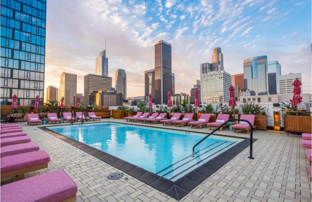 Leisure amenities include a rooftop pool overlooking Downtown LA and a fitness facility. Cultural event programming is available, offering opportunities to unwind after business activities.