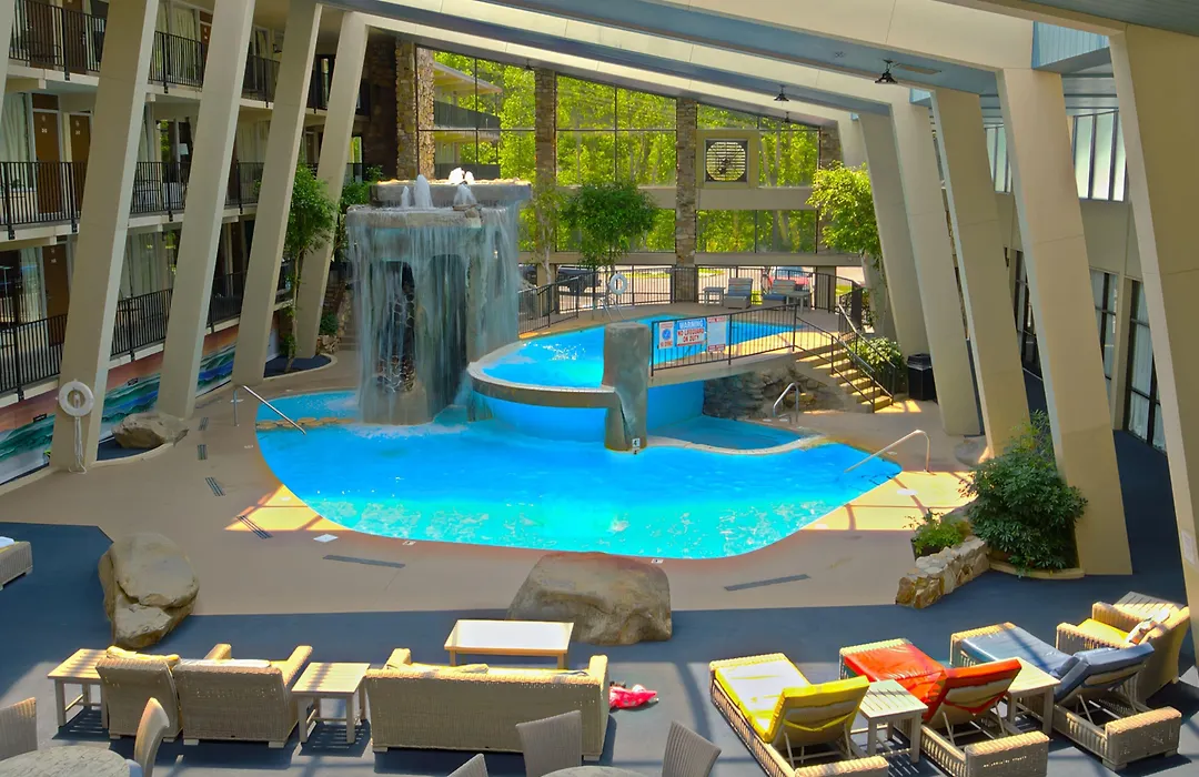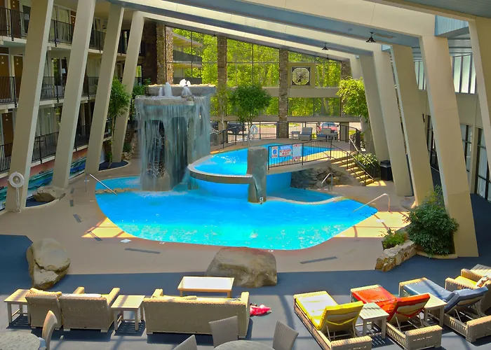 Glenstone Lodge, a 3-star hotel rated 8.3/10 on Booking.com, offers spacious accommodations and updated amenities. The lodge features indoor and outdoor pools, a restaurant, and a convenient trolley stop right in front of the property. It serves as a budget-friendly option for families and groups visiting the area.