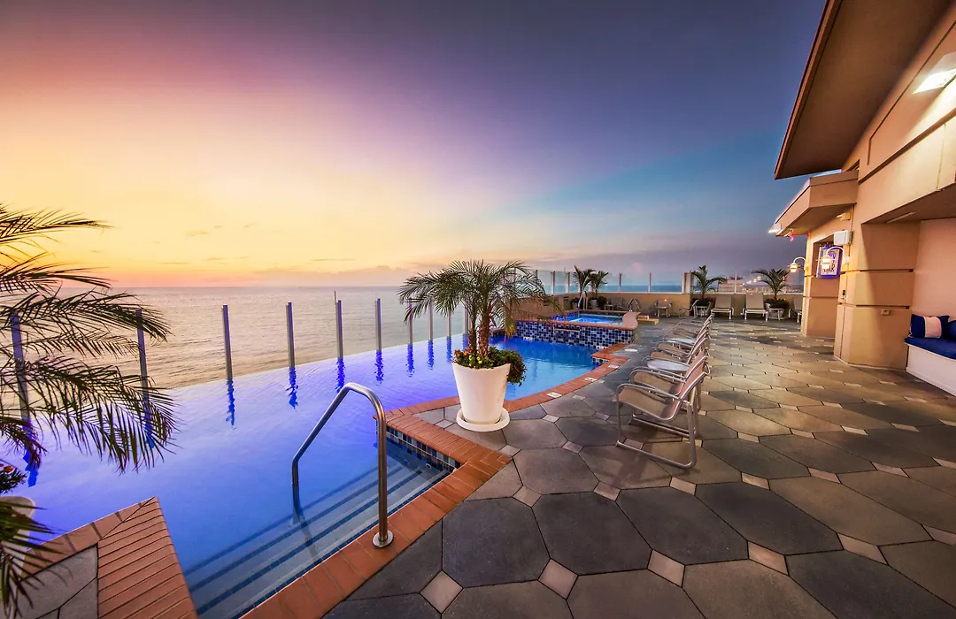 Leisure amenities include a heated indoor pool and outdoor infinity pool, both offering relaxation options. The hotel is also a venue for events and gatherings, featuring audiovisual technology and ocean view spaces for meetings.