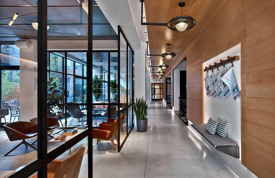 Dining options include Lindens, offering a menu emphasizing fresh ingredients from local growers. Guests can also enjoy snacks from the 24-hour market curated by Mouth NYC, which includes a variety of local treats.