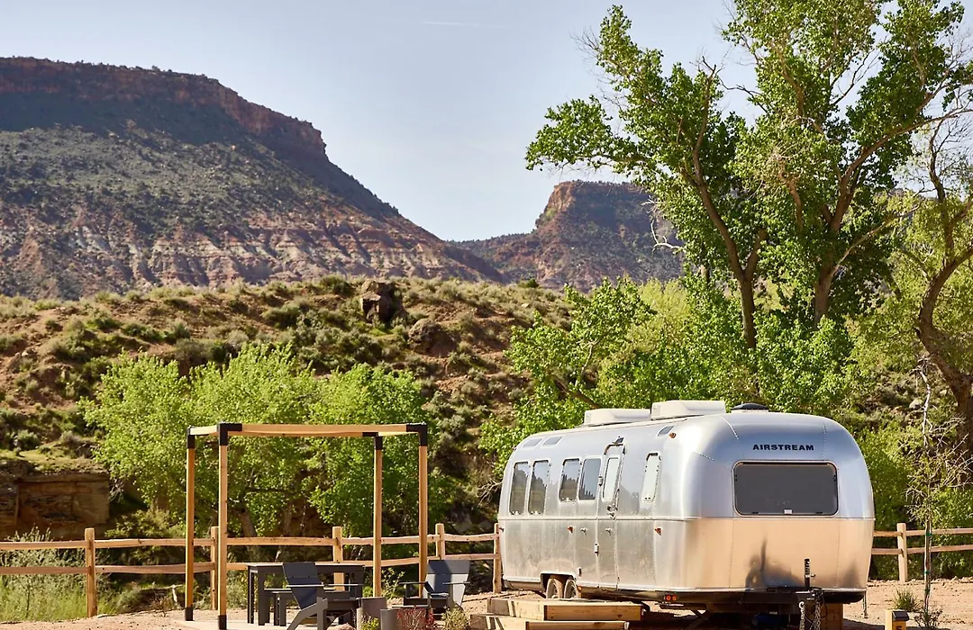 Accommodations at Autocamp Zion include modern Airstream Suites with kitchenettes and private bathrooms, as well as canvas tents suitable for families and groups. Each unit features a flat-screen TV, Bluetooth audio system, heating, and air conditioning.