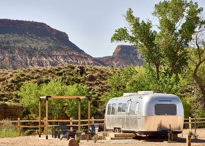 Autocamp Zion offers unique accommodations featuring modern Airstream Suites and spacious canvas tents, along with amenities such as a general store and a clubhouse. This 4-star hotel has a rating of 8.7/10 on Booking.com.