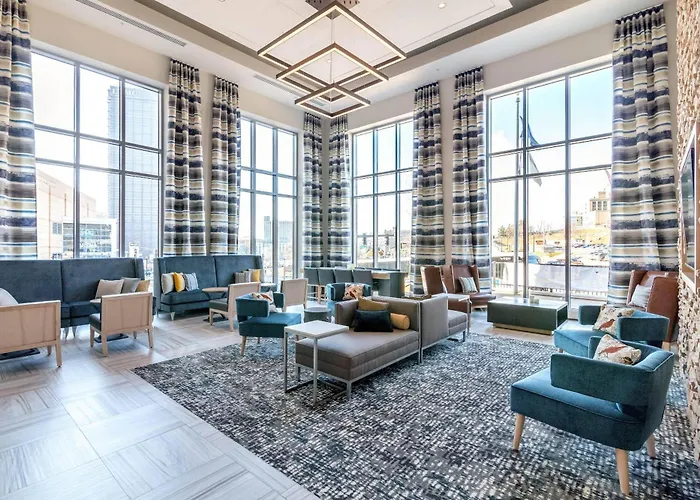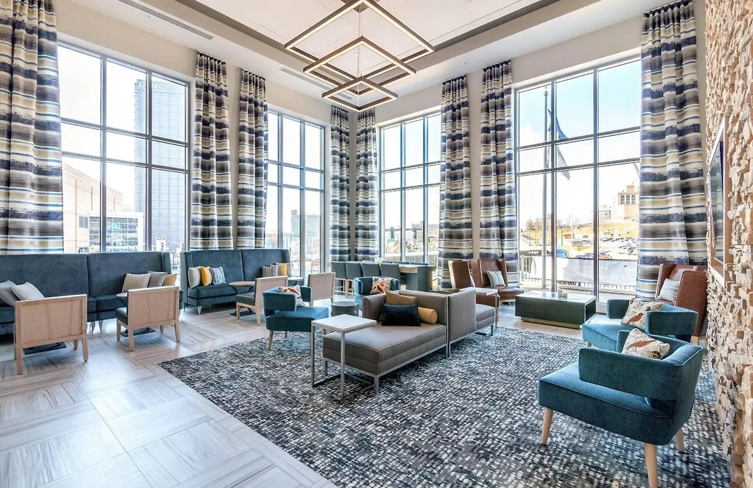 Spacious rooms at Cambria Hotel Pittsburgh - Downtown provide modern furnishings, plush bedding, and luxury linens. Accommodations include fully equipped kitchens, flat-screen TVs, and high-speed Wi-Fi. There are options for one, two, and three-bedroom suites suitable for extended stays or families.