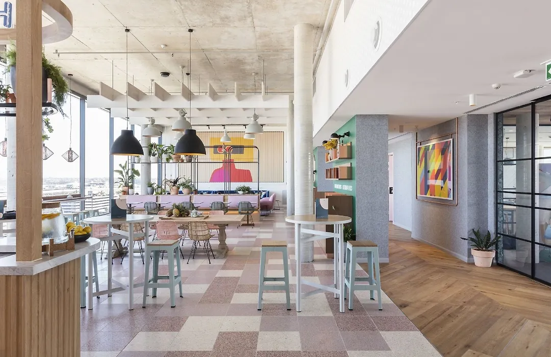 Leisure amenities include a gym, rooftop cinema, and a vibrant lounge space where guests can relax. The hotel's design incorporates bright pops of pastel colors and smooth woods, providing a modern aesthetic.