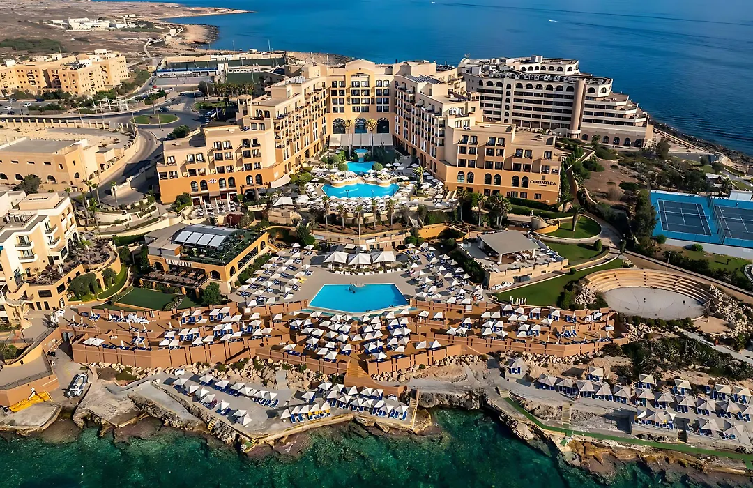 The Corinthia includes 14 meeting rooms, suitable for business events, accommodating up to 550 attendees theatre-style. Additionally, the hotel's location allows easy access to the vibrant town of Paceville, with various bars and nightlife within walking distance.