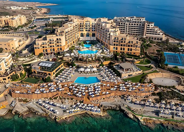 Corinthia St George'S Bay, a 5-star hotel with an 8.5/10 rating, offers luxurious amenities and a prime waterfront location featuring both sandy and rocky beaches. Facilities include an on-site spa, multiple swimming pools, and a range of dining options catering to diverse palates.