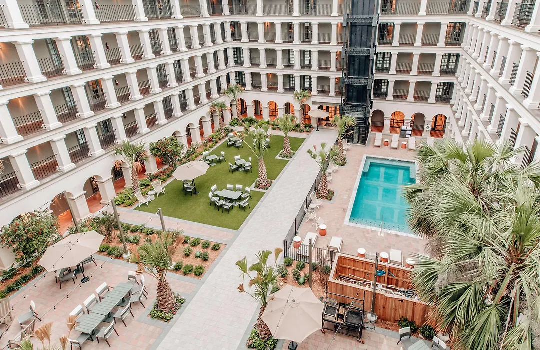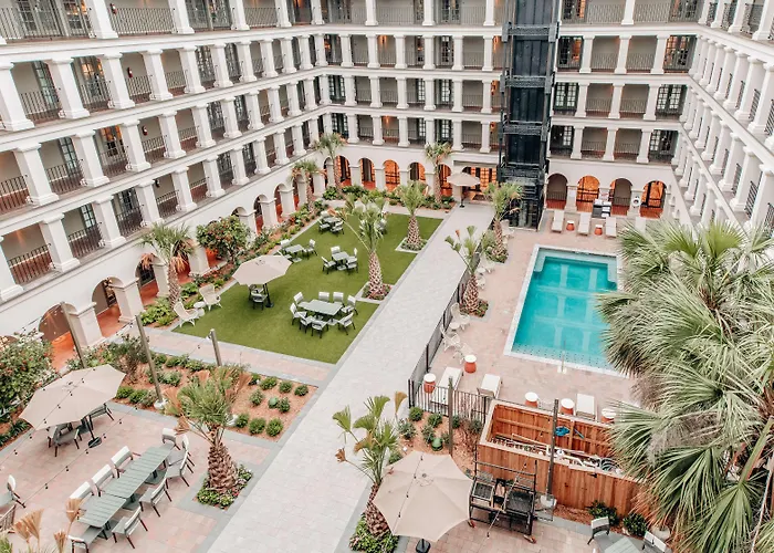 Leisure facilities include a fitness center and outdoor pool, set in a lush courtyard ambiance filled with palm trees. The hotel hosts a 24-hour business center and offers meeting spaces for events.