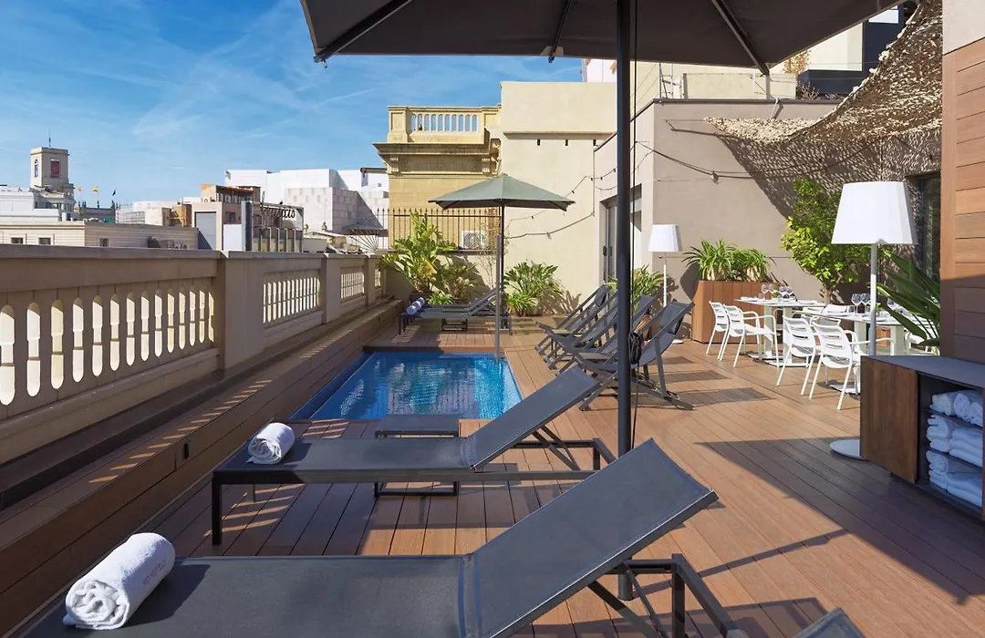 H10 Urquinaona Plaza (Adults Only), a 4-star Barcelona hotel rated 8.8/10 on Booking.com, features modern interior design incorporated within a late 19th-century building, showcasing its original structure and elegant details. Available amenities include a restaurant, lounge, and a roof terrace with city views and a plunge pool.