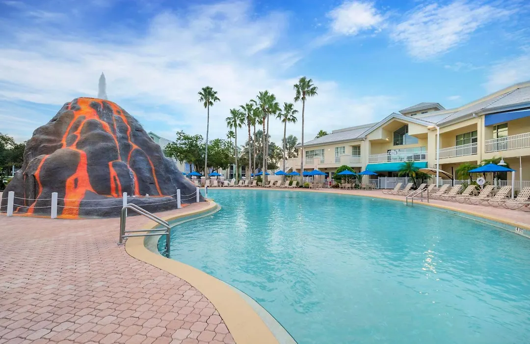 Recreational amenities include multiple pools, a volcano pool with a waterslide, a playground, and sports courts for tennis and basketball. The resort's activity center provides organized activities for families, while golf enthusiasts can enjoy the nearby Falcon's Fire Golf Course.