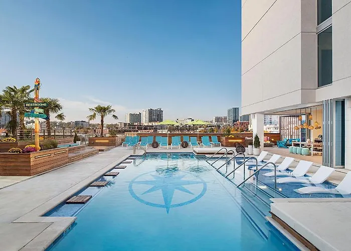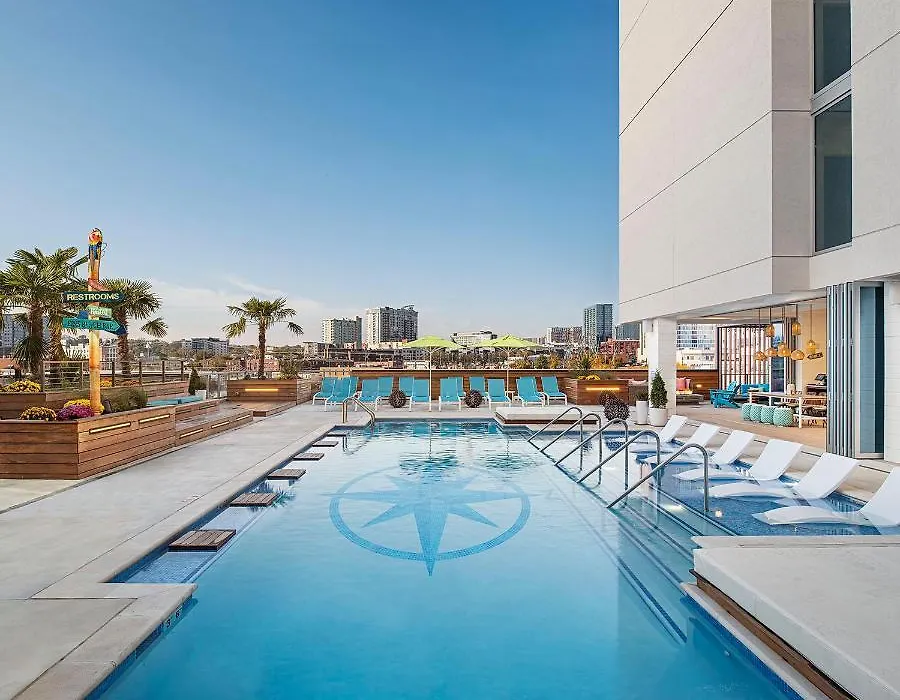 Margaritaville Hotel Nashville, a 4-star Nashville hotel with an 8.7/10 rating on Booking.com, features an urban coastal retreat atmosphere with island-inspired design elements. Amenities include a rooftop pool, Fins Bar, and a full-service Starbucks(R). Its prime location offers easy access to nearby attractions.