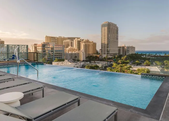 Recreational facilities cover an outdoor pool and a fitness center. Guests can explore nearby attractions like Kahanamoku Beach and the Royal Hawaiian Theater, both within walking distance.