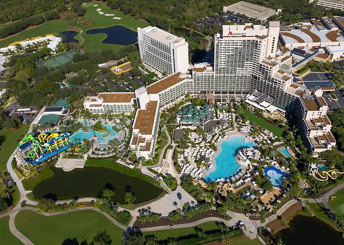 Orlando World Center Marriott, a 4-star Lake Buena Vista hotel, offers diverse amenities including a 575-foot-long lazy river and an expansive golf course. The resort is known for its family-friendly accommodations and ten dining options, making it suitable for guests of all ages.