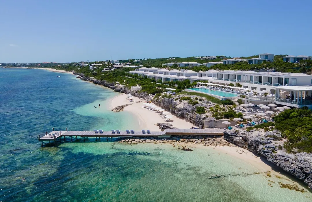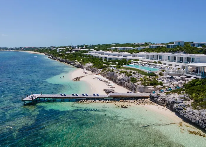 Rock House, a 5-star boutique resort with a 9.3/10 Booking.com rating, features elegant coastal accommodations and amenities, including a 100-foot infinity pool, private beach club, and various dining options. This Turtle Cove hotel offers 46 distinctive rooms that blend seamlessly with the rugged limestone cliffs.