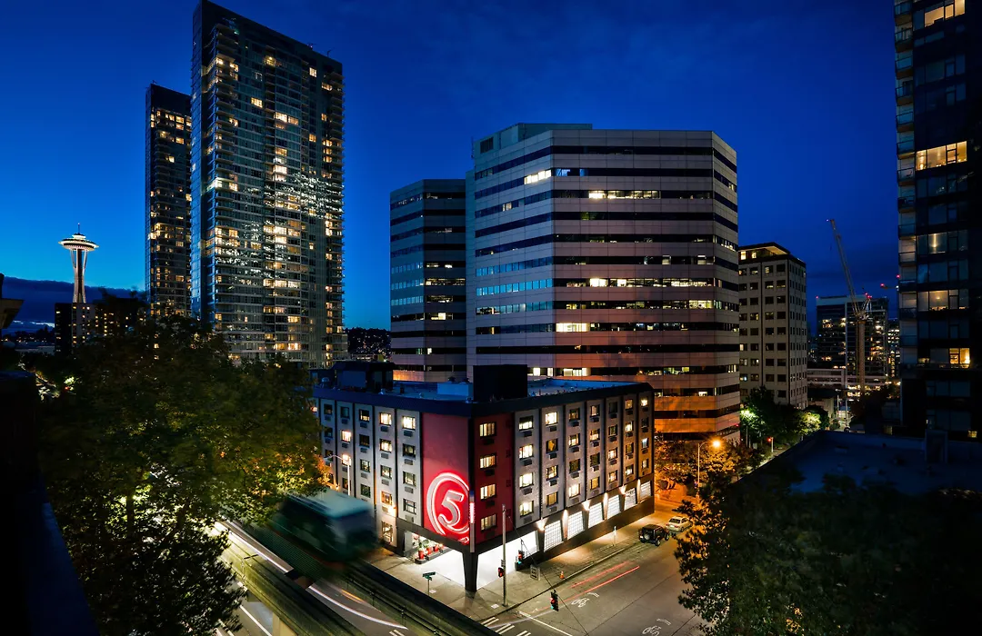 Staypineapple, Hotel Five, Downtown Seattle features 116 stylish rooms with The Naked Experience for enhanced comfort. This award-winning 3-star Seattle hotel includes amenities like high-speed Wi-Fi, complimentary bicycles, and a lobby coffee stand, making it a great option for modern travelers.