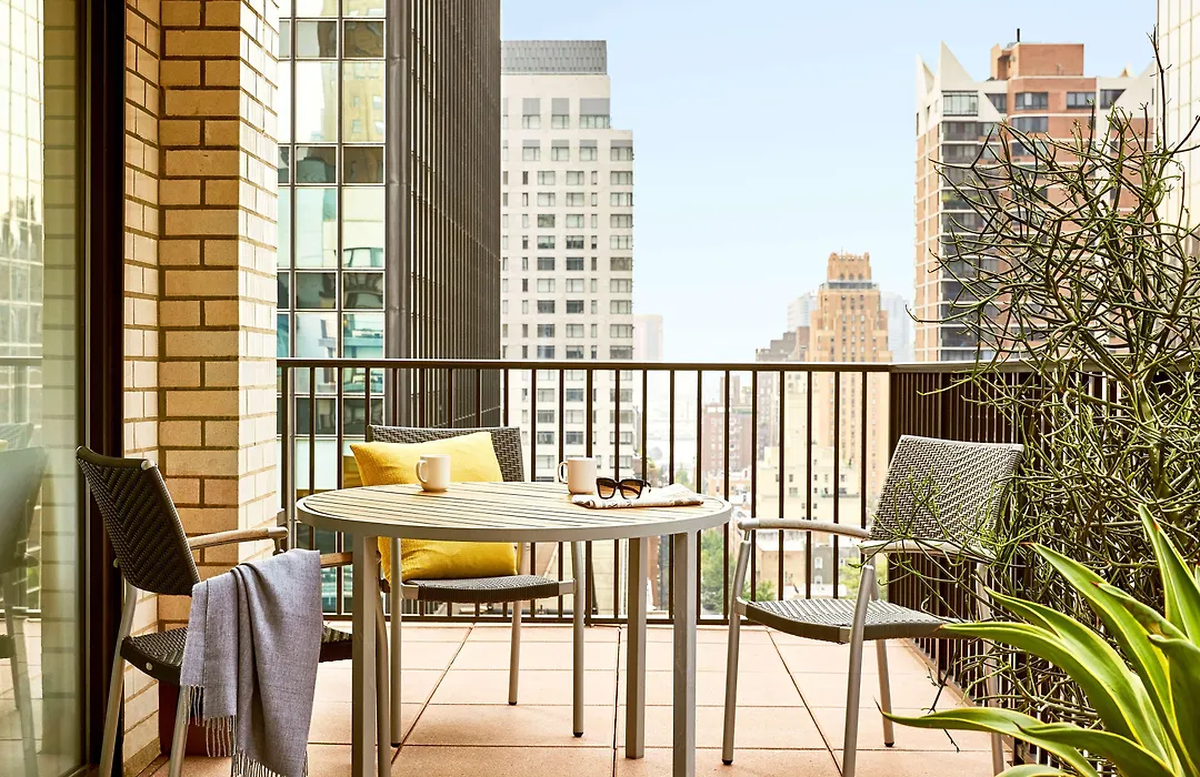 The Fifty Sonesta Hotel New York features guest rooms, studios, and suites, each equipped with urban kitchens, mini-refrigerators, and coffee makers. The spacious rooms include options with one king bed or two queen sizes, while suites are designed with separate living areas, including the One Bedroom Terrace Apartments that offer expansive views of Midtown Manhattan.