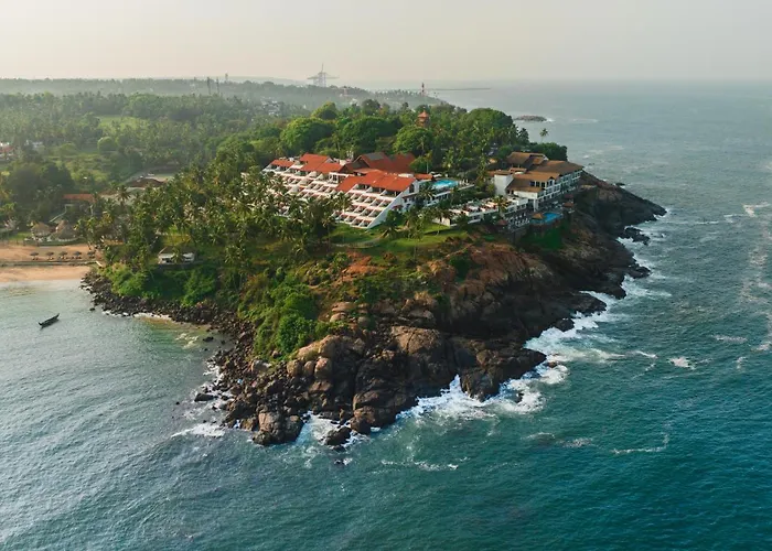 The Leela Kovalam, A Raviz Hotel is a 5-star beachfront property featuring expansive gardens, three swimming pools, and an award-winning wellness center. Guests benefit from personalized Butler services and an array of dining options, including specialty seafood at The Tides. The hotel combines modern luxury with elements of royal heritage and Kerala's cultural richness.