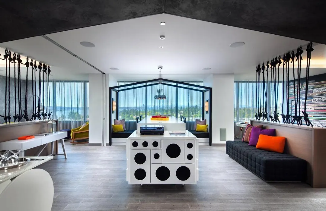 Accommodations at W Bellevue include 220 rooms and 25 suites, each featuring creative décor and a cozy window seat. Standard amenities include flat-screen TVs, seating areas, and mini-bars. Travelers can enjoy city or lake views from select rooms.