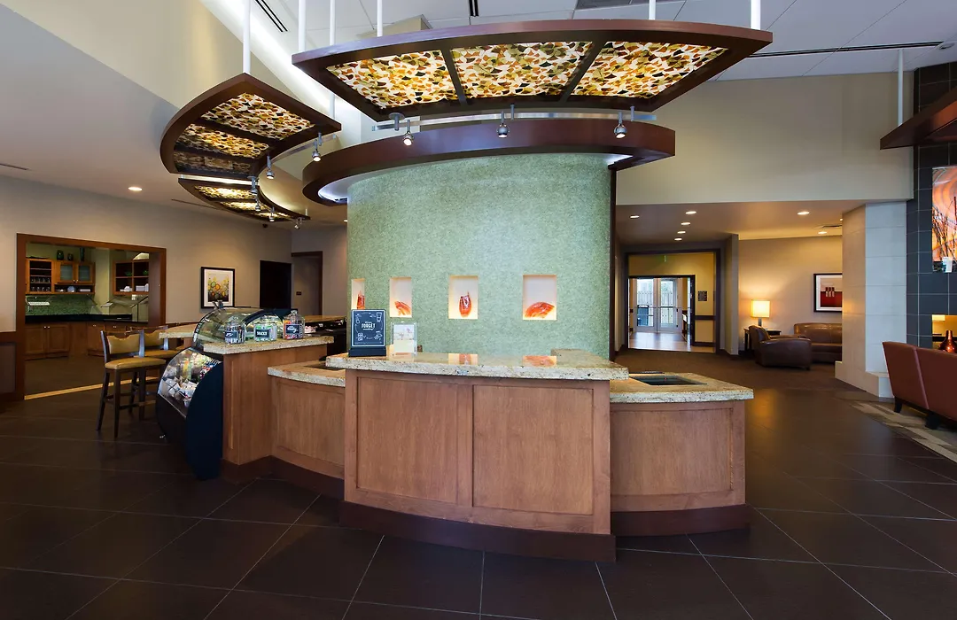 Dining options include a daily continental breakfast buffet and a restaurant serving made-to-order cuisine. The Bakery Café offers Starbucks coffee, beers, and wines. Nearby dining includes popular choices like Red Lobster and Chick-fil-A, situated within a half-mile of the hotel.