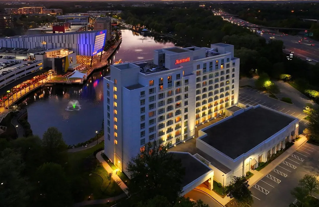 Gaithersburg Marriott Washingtonian Center features spacious rooms with premium bedding and is a 4-star hotel rated 8.7/10 on Booking.com. Amenities include free WiFi, a fitness center, and a lakeside restaurant. It is conveniently positioned near shopping and dining options.