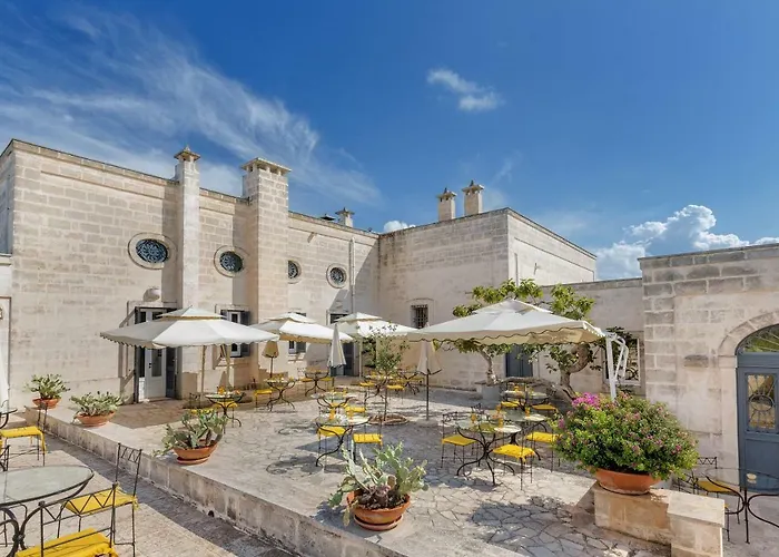 Masseria San Domenico, a 5-star Savelletri hotel with a 9.6/10 rating on Booking.com, features an outdoor freeform swimming pool, a Thalassotherapy spa, and two private beach clubs. This 15th-century masseria offers a boutique-style intimacy amidst lush palm-shaded gardens.