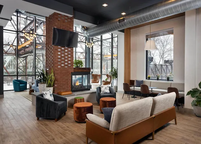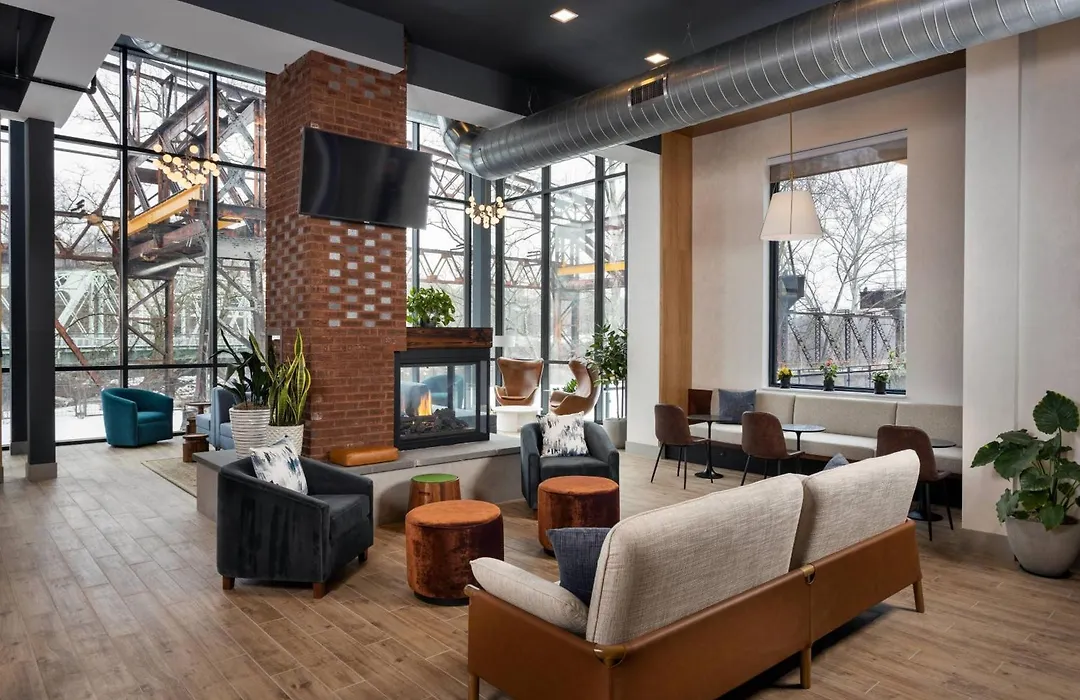 Dining options include The Landing Kitchen, which offers fresh American cuisine with river views, and Lark Restaurant on the seventh floor for an upscale dining experience. Guests can enjoy a complimentary buffet breakfast daily.