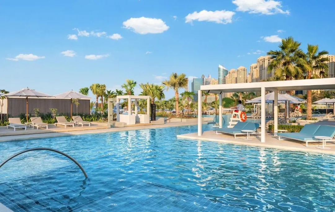 Address Beach Resort, a 5-star Dubai hotel, features the world's highest outdoor infinity pool and direct beach access. The resort encompasses two 77-story towers connected by a sky bridge and offers a range of upscale amenities including a bar, gym, and wellness center.