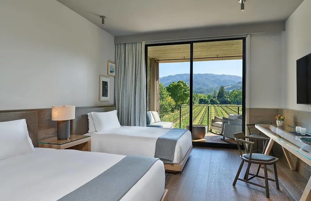 Alila Napa Valley offers 68 air-conditioned rooms equipped with minibars, flat-screen TVs, and premium bedding. Oversized sliding doors provide access to spacious patios with vineyard views, enhancing the comfort and aesthetic appeal of the accommodations.