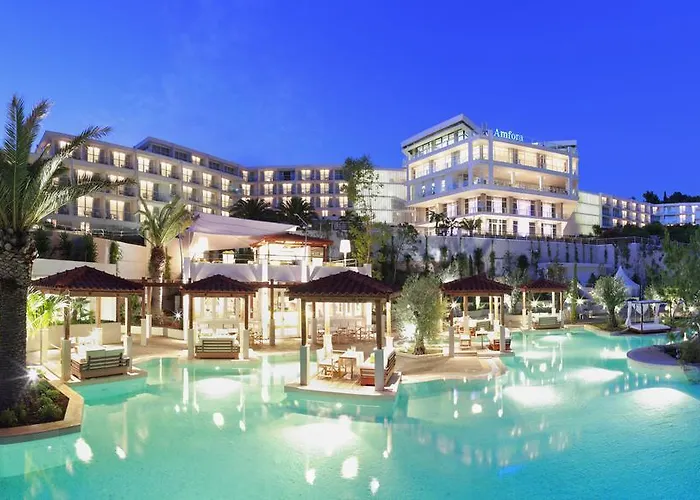 Amfora Hvar Grand Beach Resort, a 4-star hotel, features a cascading pool, multiple dining options, and modern amenities. This Hvar Town hotel is ideal for family vacations and romantic getaways, providing easy access to beautiful beaches and local attractions.