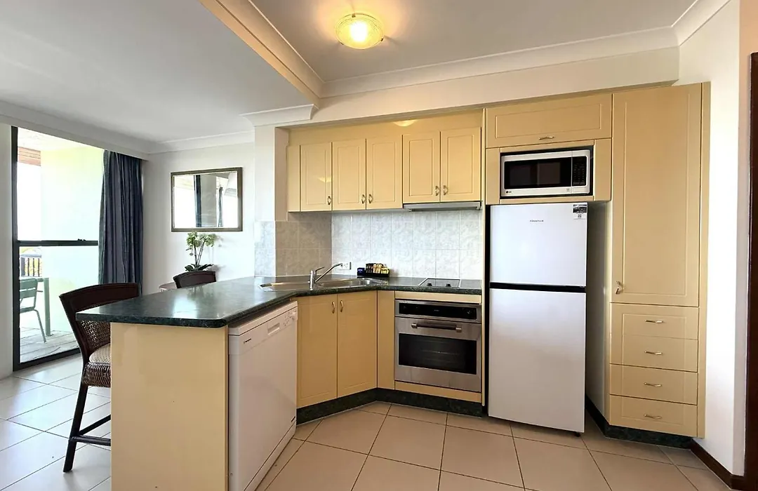 Water's Edge Resort features 49 one, two, and three-bedroom self-contained apartments, each with a full kitchen, lounge room, and en suite bathroom. Modern furnishings and Balinese decor are present throughout, along with private balconies offering ocean views.