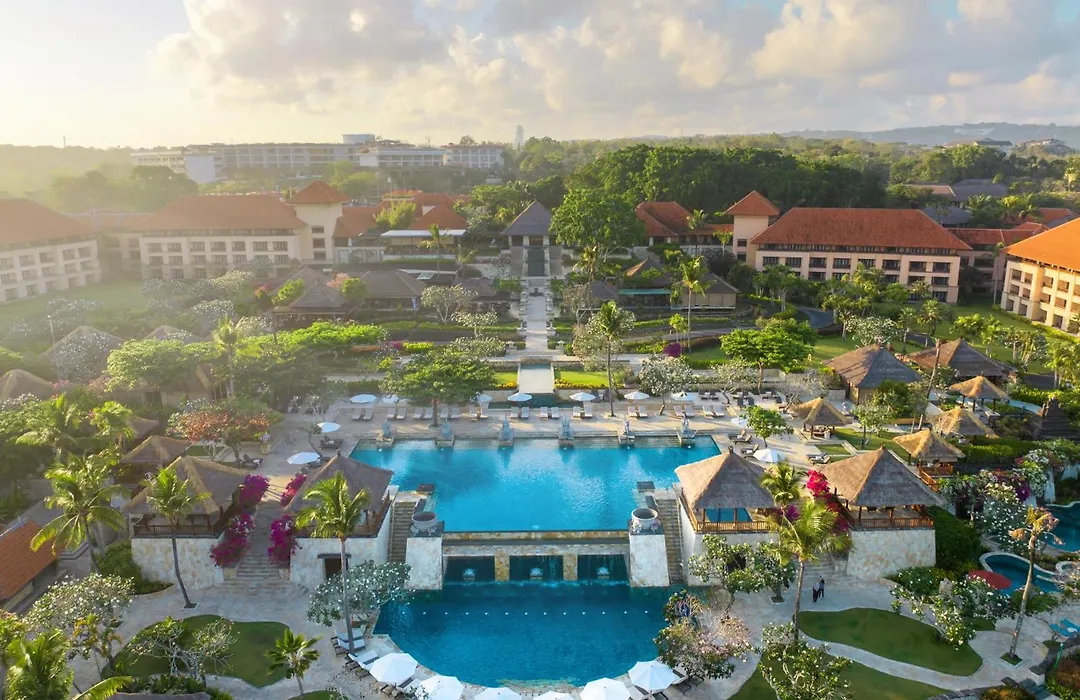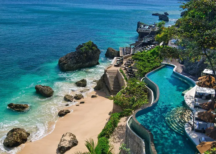 Ayana Resort Bali, a 5-star hotel rated 9.0/10 on Booking.com, features a sprawling open-air complex set atop cliffs with views over Jimbaran Bay. Amenities include 14 swimming pools, multiple dining venues, and a world-class spa, offering extensive wellness options.