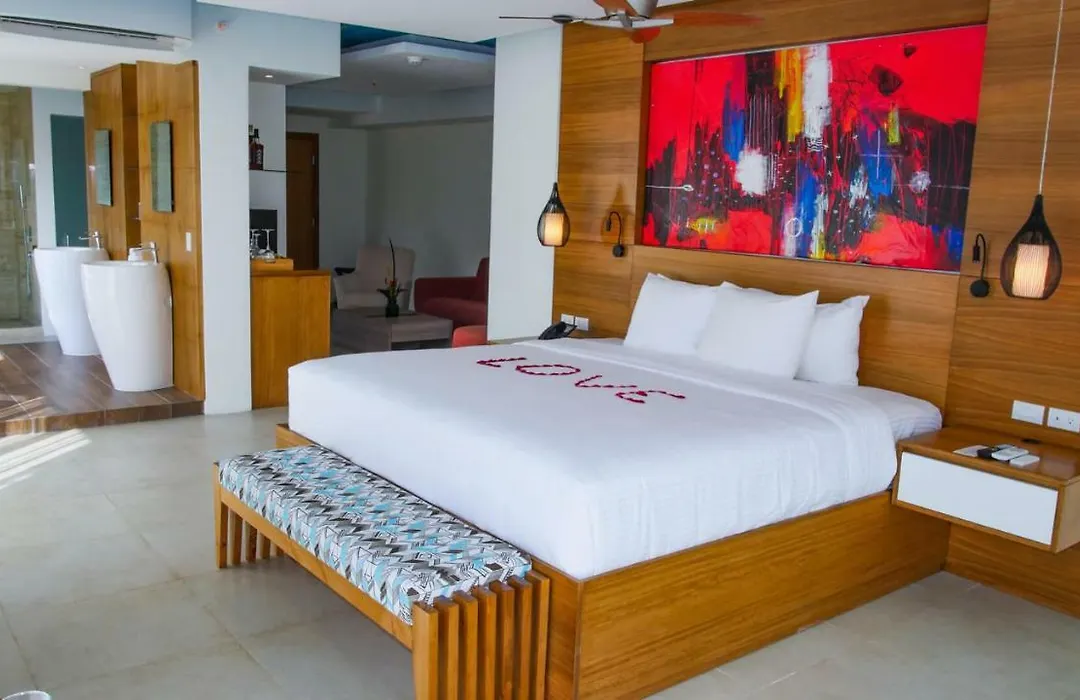 Accommodations at Azura Beach Resort (Adults Only) include 75 suites available in 10 categories, such as Ocean View Jr Suites and Presidential Suite with a private pool. Each suite features modern amenities like a flat-screen TV, seating area, and private bathroom with luxury spa-inspired amenities.