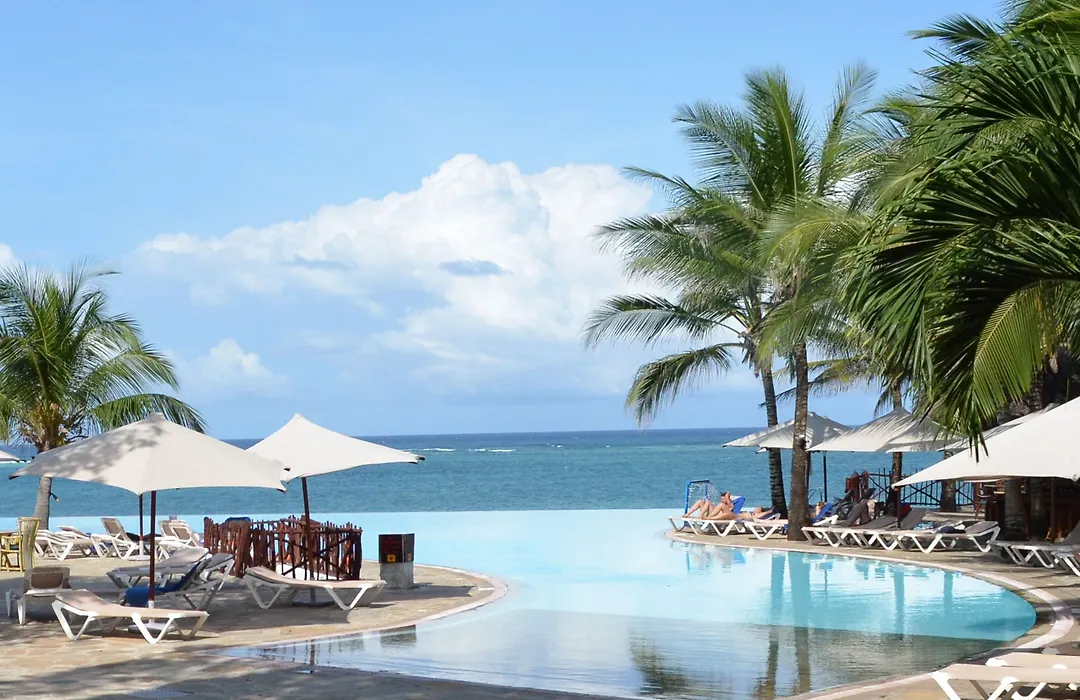 Baobab Beach Resort & Spa is a 4-star Diani Beach hotel featuring three swimming pools and a signature spa inspired by African-Swahili architecture. Guests have access to five dining venues and various land and water activities within a lush tropical setting. The resort is rated 8.7/10 on Booking.com.