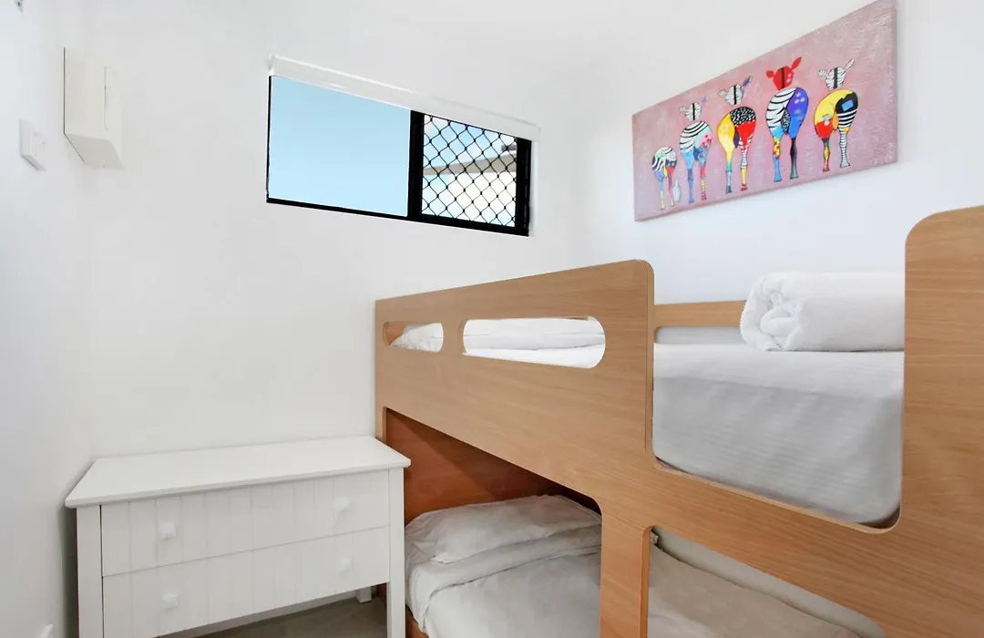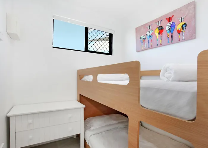 Beach Club Resort Mooloolaba offers 75 air-conditioned apartments featuring living rooms with smart TVs, kitchens (without ovens), and large balconies. Some units provide ocean glimpses, while one-bedroom family units are available with various configurations. The property includes complimentary game hire and onsite kiosk offering drinks and snacks.