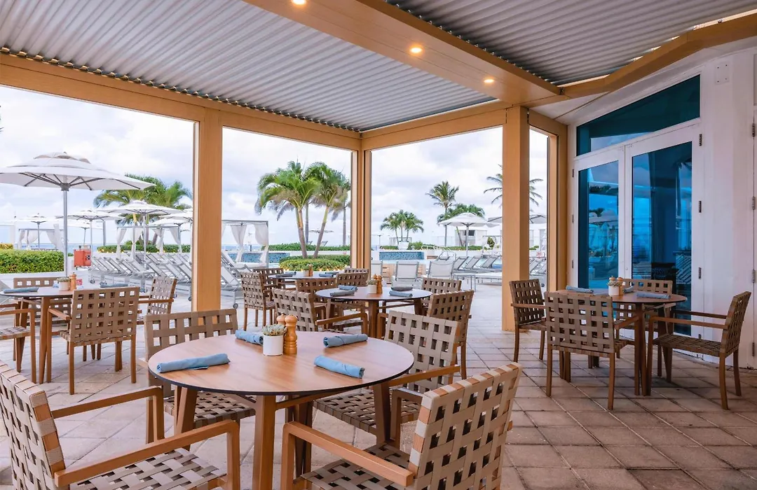 Dining options include the trendy S3 sushi restaurant, which offers an oceanfront patio, and Le Marche Gourmet Market serving casual French and American dishes. Guests can enjoy meals while looking out over the ocean and pool areas, with 24-hour room service available.