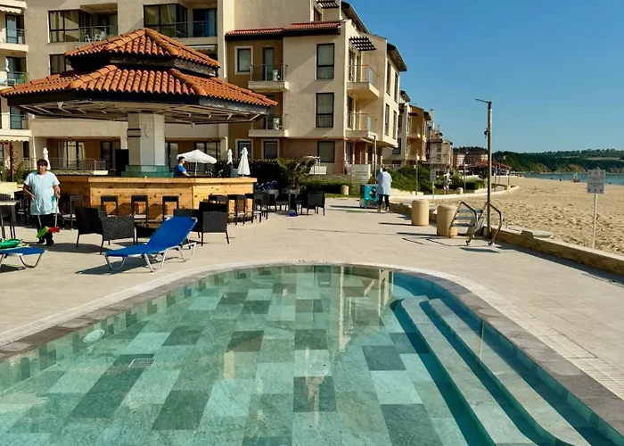 Obzor Beach Resort, a 4-star accommodation rated 8.1/10 by Booking.com, features 523 apartments set across seven buildings, with key facilities such as five outdoor pools, a spa center, and diverse dining options. The property is situated along the fine sandy beach and offers a variety of activities and entertainment.