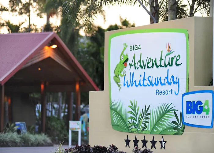 BIG4 Adventure Whitsunday Resort offers a family-friendly vacation experience with 4-star accommodations and a top Booking.com rating of 9.2/10. The resort features various amenities including Airlie Beach's largest resort pool, a mega waterslide park, and a Kid's Club. Its extensive range of accommodations caters to different tastes and budgets.