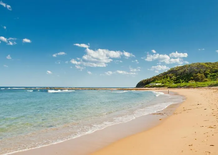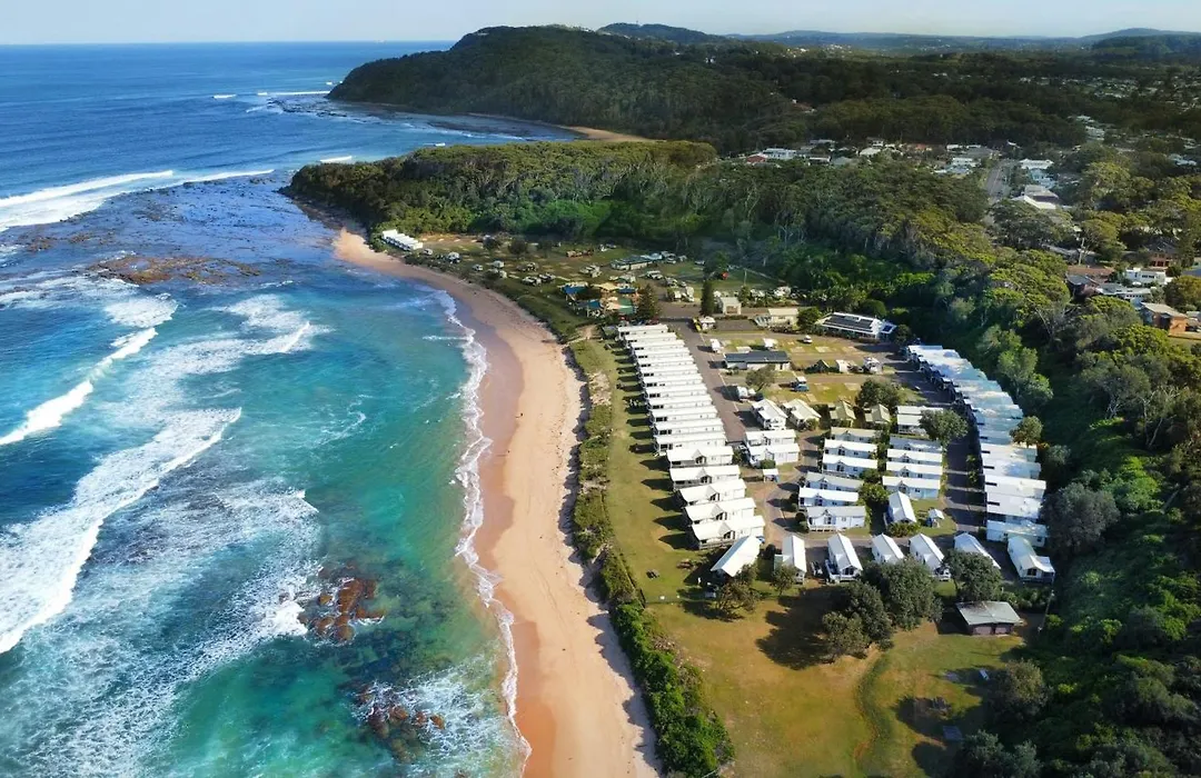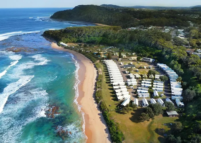 Blue Lagoon Beach Resort offers direct access to Shelly Beach, featuring a 3-star accommodation with 53 self-contained cabins and studios, outdoor heated pool, and a games room. It's the only holiday park on the Central Coast with an absolute beachfront location, catering to families and camping enthusiasts.