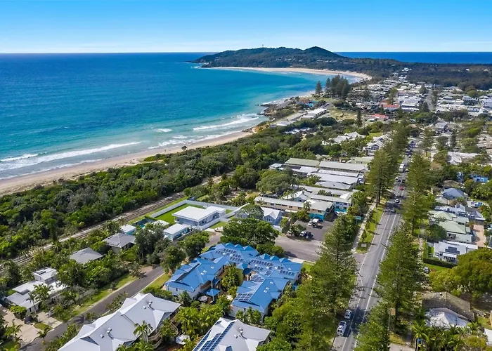 Guests can enjoy the resort's central swimming pool or relax in the heated outdoor spa after a day of exploring the area. Popular activities include visiting the Julian Rocks Marine Reserve for snorkeling and the nearby Belongil Beach for surfing and relaxation.