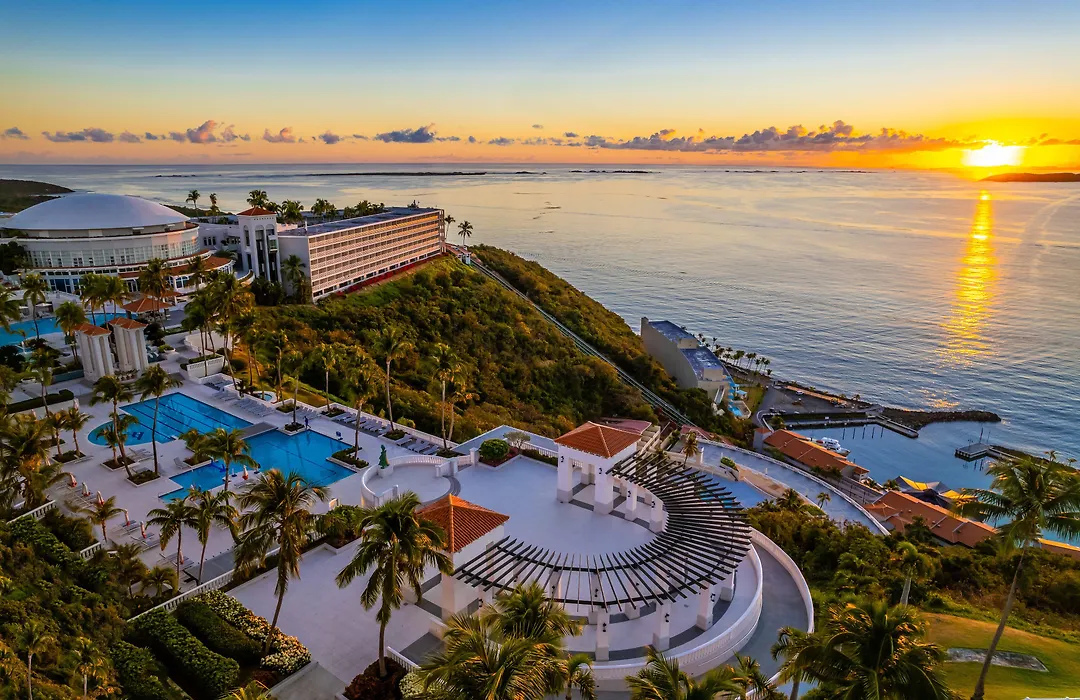 Leisure features at El Conquistador Resort include the exhilarating Coqui Water Park, a private beach on Palomino Island, and multiple swimming pools. An 18-hole golf course offers scenic views, while tennis courts and organized activities cater to all ages.