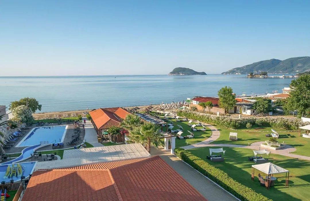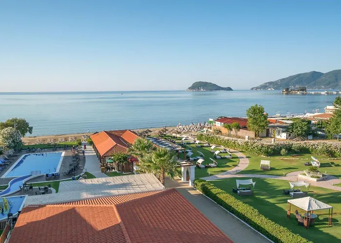 Leisure facilities feature a large pool area, water sports, and a children's club, enhancing the family-friendly atmosphere. Guests can explore local attractions such as Laganas Beach, renowned for its vibrant nightlife and marine park, just one kilometer away. A comprehensive all-inclusive program ensures guests enjoy a stress-free vacation.
