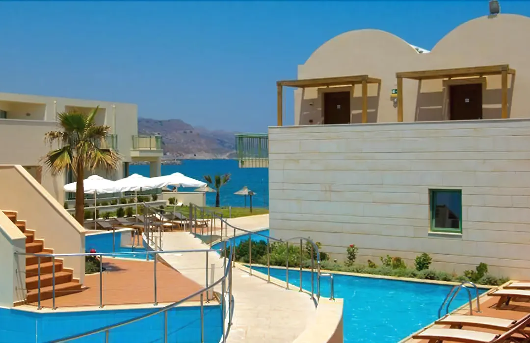 Leisure facilities include a fitness room equipped with basic gym equipment, a main swimming pool, and direct access to a sandy and pebble beach. Activities such as cycling and trekking are readily accessible, including visits to famous local sites like the Gonia Monastery and Samaria Gorge.
