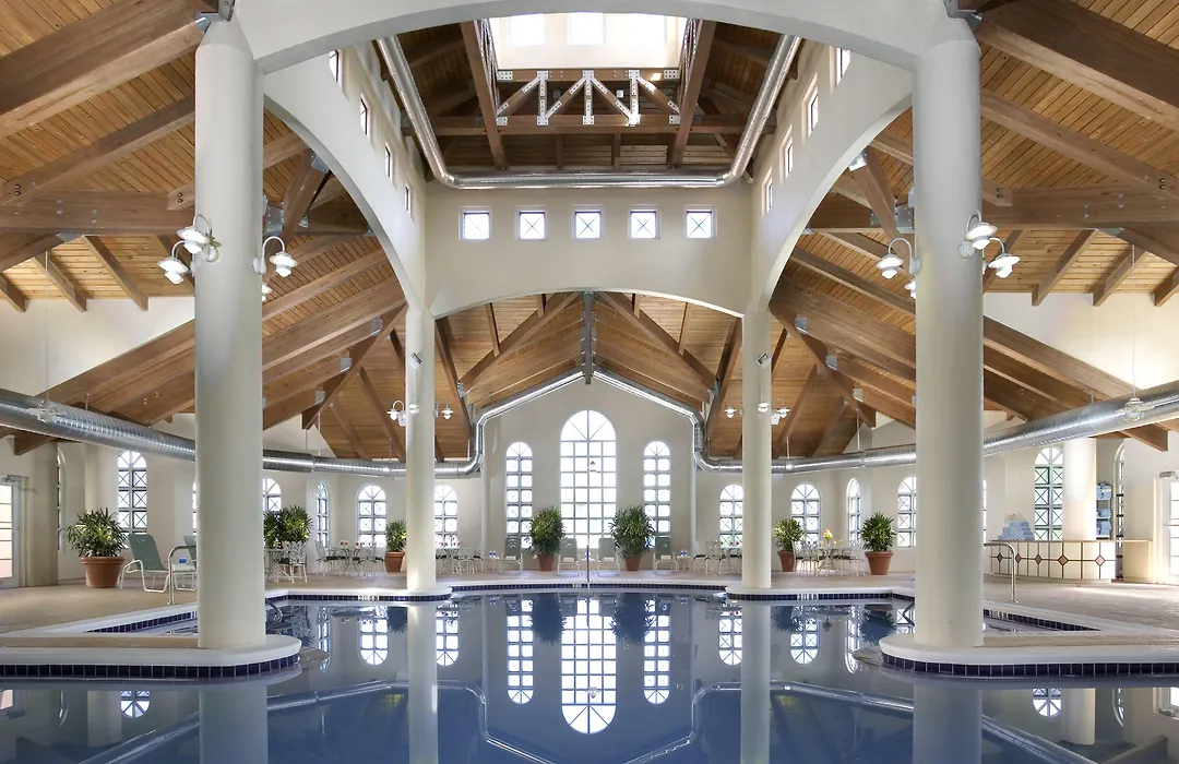 The resort features a comprehensive water park with a lazy river and three-story water slide, as well as a full-service spa with ten treatment rooms. Recreational activities include championship-level golf, eight hydro-grid clay tennis courts, and various family-oriented events through the Kids Crew program.
