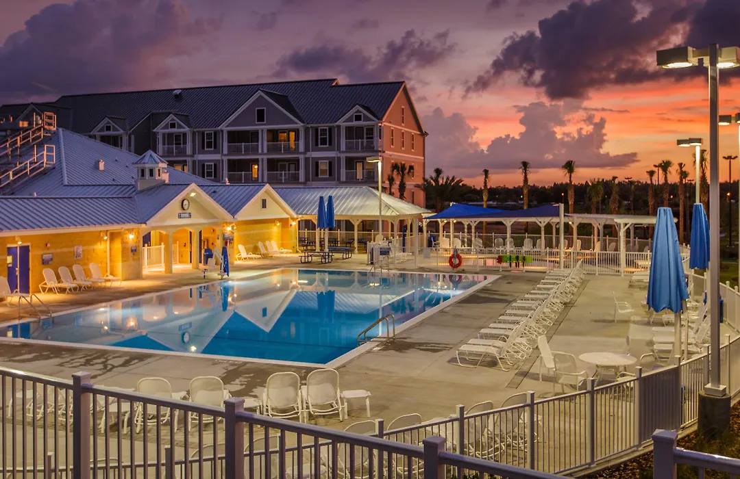 The resort offers two outdoor pools, one heated to 84 degrees, along with a kiddie pool, a movie theater, mini golf course, and an arcade. Guests can also enjoy sports courts for tennis, basketball, or volleyball and a fitness center.