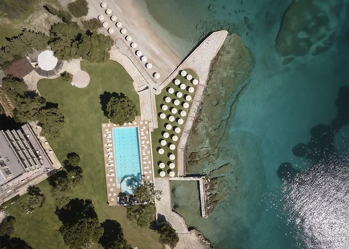 Kalamaki Beach Resort, a 4-star Isthmia hotel rated 8.5/10 on Booking.com, features a private beach with grass and white pebbles, complemented by lush gardens and two swimming pools. The resort offers extensive sports facilities, including four tennis courts and a fitness room.