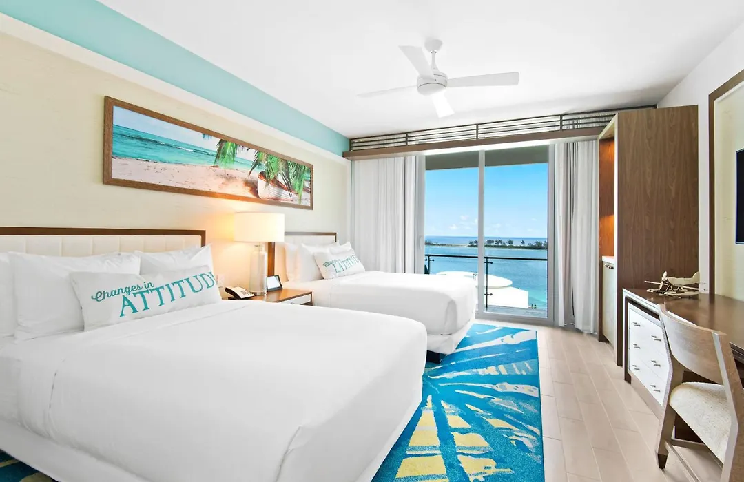 Rooms at Margaritaville Beach Resort Nassau include modern amenities with air conditioning, flat-screen TVs, and various accommodations, from standard rooms to luxury residences with full kitchens. Guests can enjoy ocean views from many units and benefit from complimentary WiFi access.